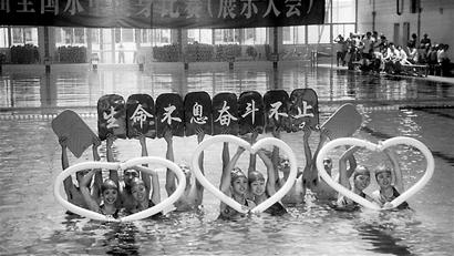 在“你說你的美麗已經(jīng)不再,地動山搖將你變得蒼白”的朗誦聲中,阿壩師專拉拉操隊員開始了他們的自選動作表演——一套反映從地震發(fā)生時的無助到重建家園信心十足的水中健身操。