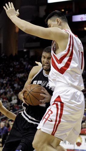 雖然說火箭最終輸?shù)袅吮荣,但是我們卻在比賽中欣喜的看到了一件事情,那就是,姚明在面對自己的老對手鄧肯的時候,終于扭轉了自己一貫以來的頹勢。其實在NBA中一直就有這么一種說法,鄧肯在場上怕奧尼爾,奧尼爾怕姚明,而姚明則怕鄧肯,三人之間形成了一個循環(huán)套。,但是,今天姚明的表現(xiàn),卻接開了這個循環(huán)套中打得最死的一個結。