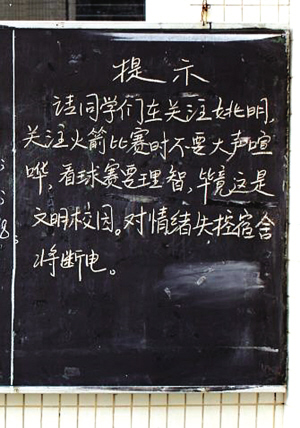 在廣州某大學,為限制學生狂熱的心情,宿管處黑板上出現(xiàn)了一個奇怪的布告:請同學們在關注姚明、關注火箭比賽時不要大聲喧嘩,看球賽要理智,畢竟這是文明校園。對情緒失控的宿舍將斷電。