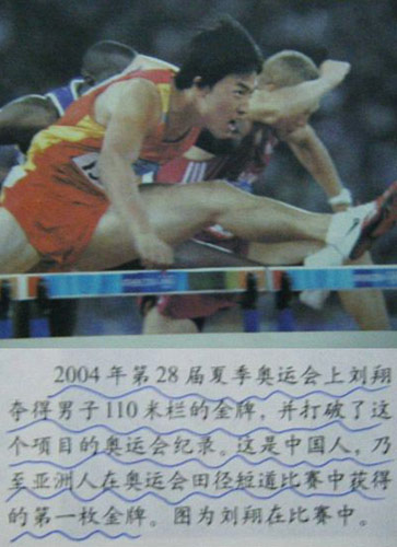 在圖片下附著的文字說明這般寫道:“2004年第28屆夏季奧運會上劉翔奪得男子110欄的金牌,并打破了這個項目的奧運會紀錄。這是中國人乃至亞洲人在奧運會田徑短道比賽中獲得的第一枚金牌。圖為劉翔在比賽中!