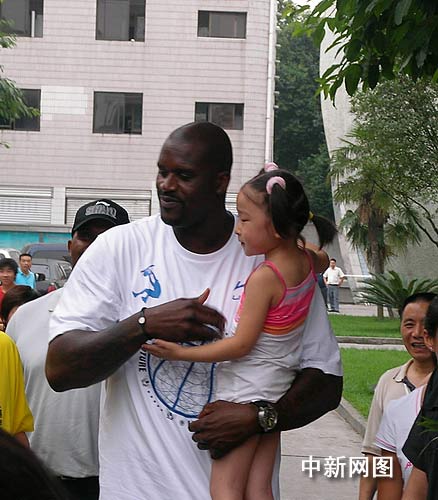 奧尼爾一下車(chē),就受到孩子們的擁戴,現(xiàn)場(chǎng)一片歡呼聲和歡迎聲。已經(jīng)有了三個(gè)孩子的奧尼爾,興奮地抱起給他獻(xiàn)花的一位七歲小女孩,親了親她的臉頰。在人們的簇?fù)硐,奧尼爾參觀(guān)了汶川地震發(fā)生后修建的板房以及新校舍,詳細(xì)了解災(zāi)后孩子們的學(xué)習(xí)生活狀況。