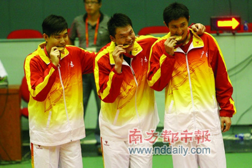 往前一天,山東隊半決賽擊敗江蘇后,全隊也曾在賽后以這種方式慶祝,似乎冠軍已是囊中之物。但同樣的晚上,廣東隊經(jīng)過一節(jié)加時賽艱難戰(zhàn)勝解放軍,卻看不出有誰顯得很興奮。小伙子們說,本來四節(jié)比賽就可以贏對手10分的,非要通過加時賽這種方式進決賽,哪還有心情慶祝。包括昨天,也是這樣,本來早早就可以讓決賽失去懸念,最后卻只是有驚無險地以5個凈勝分奪冠,隊員們回到更衣室后,平靜得就像是剛剛打完一場聯(lián)賽。