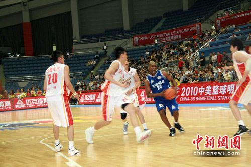 5月7日,周五的晚上,2010年中美明星籃球賽在浙江杭州黃龍?bào)w育館開賽。和姚明搭檔過的卡爾-蘭德里,拿過NBA總冠軍的“手套”佩頓,代表美國國家隊(duì)拿過奧運(yùn)會金牌的里奇蒙德……賽前,主辦方的宣傳詞句中,不乏璀璨的光環(huán)。