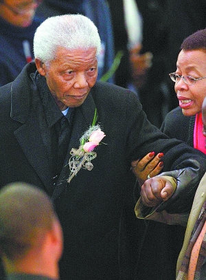 澤娜妮是在世界杯開幕前夜不幸遇難的,91歲高齡的曼德拉也因此取消了出席開幕式的計劃。上午8時,悼念儀式在學校禮堂舉行。熱愛音樂的澤娜妮生前是該校唱詩班和樂隊的成員,幾乎每個人都喜歡這位性格開朗、活潑的小女孩。儀式以一首悼念歌曲開始,緊接著播放了一組幻燈片,由澤娜妮與曼德拉開心擁抱的合影組成。隨后,幾位親屬代表上前致悼詞。老曼德拉也在親人的陪伴下,步履蹣跚地來到儀式現(xiàn)場,他的衣襟上別著一小簇粉紅色的花束,始終坐在前排,神情十分哀傷。