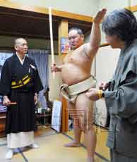 下午4點半過后,來到工作室的朝青龍笑著說:“這是第一次,所以很緊張。我會努力的。”朝青龍系上白色相撲腰帶,右手持寶棒,左手抬起,擺出憤怒的表情,拍下了照片。