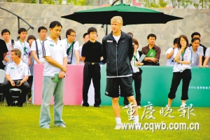 昨天北京氣溫驟降,下起了大雨。一直到中午,大雨才停。下午兩點(diǎn)半,50歲的溫格準(zhǔn)時(shí)出現(xiàn)在球場(chǎng)邊,雖然天氣偏冷,但仍然穿著短褲運(yùn)動(dòng)衫,顯示了一位職業(yè)教練的素養(yǎng)。在對(duì)這支中學(xué)生希望隊(duì)進(jìn)行20米T字跑、彈跳等基本測(cè)試后,溫格選出了10名隊(duì)員分成兩組進(jìn)行15分鐘的對(duì)抗賽。在觀看這些未來(lái)之星的表現(xiàn)時(shí),溫格像在英超執(zhí)教一樣認(rèn)真,并給了隊(duì)員們適當(dāng)?shù)慕ㄗh。