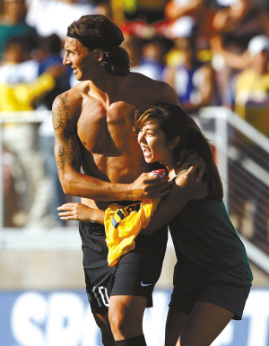 美國國際足球挑戰(zhàn)賽,一名亞裔美少女球迷沖進(jìn)場(chǎng)內(nèi)熊抱伊布,反倒讓國米球星面露尷尬。前天,墨西哥美洲隊(duì)在點(diǎn)球大戰(zhàn)中以5比4戰(zhàn)勝國米。伊布下半時(shí)替補(bǔ)上場(chǎng)后顯得毫無斗志,賽后馬上脫下了國米特制的百年紀(jì)念版藍(lán)黑戰(zhàn)袍。西班牙媒體報(bào)道,最快在本周五,伊布將穿上巴塞羅那球衣。