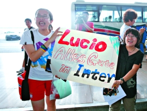 現(xiàn)場還有兩位女球迷顯得非常安靜,她們手上的自制海報(bào)寫著“Lucio Alles Gute in Inter(盧西奧,在國米一切順利)”,還高舉著拜仁的球衣,當(dāng)盧西奧現(xiàn)身時(shí),其中一位女球迷狂叫著“盧西奧”的名字,飛奔至國米大巴邊,被兩位保安攔下。