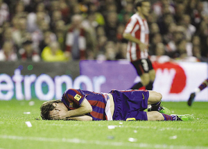 不過最讓巴薩不爽的還不是無奈將榜首席位讓給死敵皇馬,而是該隊(duì)頭牌梅西在比賽中兩度受傷。先是在第20分鐘,梅西在爭搶時(shí),被對方身高1米92的中衛(wèi)埃莫雷維埃抬腳亮出的鞋釘狠狠踩中右臉部,顯然埃莫雷維埃抬腳過高就是故意沖著梅西去的。梅西當(dāng)即痛苦地捂臉倒地,隊(duì)醫(yī)立即進(jìn)場緊急處理,好一會梅西才起身,但靠近右眼的部分已經(jīng)被鞋釘劃出了一道很深的血口。但梅西還是堅(jiān)持比賽,因此盡管梅西此戰(zhàn)沒能進(jìn)球幫助巴薩取勝,但賽后梅西帶傷作戰(zhàn)的精神卻贏得了媒體的一致贊揚(yáng)。但在第76分鐘,梅西因肌肉拉傷還是提前被博揚(yáng)換下。據(jù)悉,梅西賽后檢查的結(jié)果是傷勢很重,極可能將缺席本周在歐冠、西甲中與國米、皇馬的兩場關(guān)鍵戰(zhàn)役。