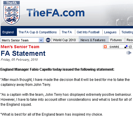 英格蘭主帥卡佩羅在英足總官網(wǎng)上的聲明中表示:“經(jīng)過深思熟慮后,我決定撤銷約翰·特里的隊長職務(wù)。作為國家隊隊長,約翰·特里在場上的表現(xiàn)無可挑剔,但我要做出的決定更多的是為了整個英格蘭隊考慮!