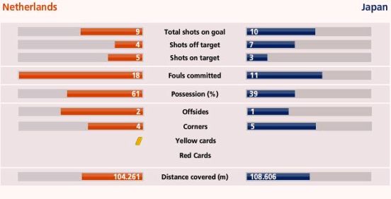 荷蘭隊全場比賽有9腳射門,5次射中門框范圍內(nèi),其中包括一個進(jìn)球和兩次被日本隊門將川島永嗣化解的必進(jìn)球機(jī)會。日本隊有10腳射門,3腳射中門框范圍,其中最后階段的一次射門險些將比分追平。日本隊的角球同樣多于荷蘭隊,5次角球,比荷蘭隊多了一個。