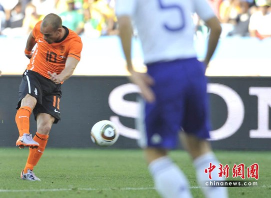 在經(jīng)歷了多半場(chǎng)比賽的僵持后,第53分鐘,“橙衣軍團(tuán)”終于撕開對(duì)手防線,范佩西回做,斯內(nèi)德禁區(qū)外沒有停球直接大力遠(yuǎn)射,日本門將川島永嗣奮力撲救,足球碰到他的左臂彈進(jìn)網(wǎng)窩,1比0,荷蘭隊(duì)取得勝利。