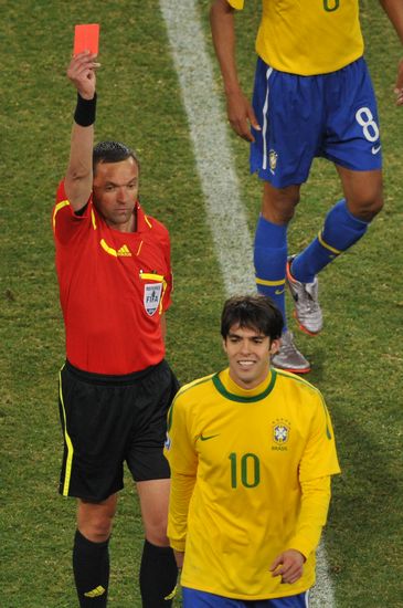 中新網(wǎng)6月21日電 第二張黃牌!裁判員出示紅牌將卡卡罰下!在世界杯小組賽巴西隊(duì)對(duì)科特迪瓦隊(duì)的比賽中,巴西隊(duì)中場(chǎng)核心卡卡吃到紅牌下場(chǎng),并且可能面臨被追加處罰的危險(xiǎn)。作為世界足球先生而在世界杯賽場(chǎng)被罰下,卡卡直追法國(guó)惡漢齊達(dá)內(nèi)!