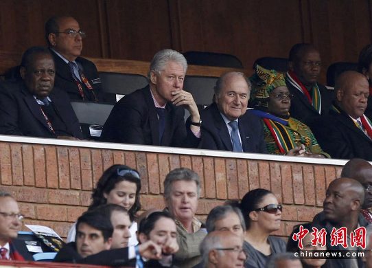 中新網(wǎng)6月24日電 23日晚,美國(guó)隊(duì)?wèi){借著補(bǔ)時(shí)階段多諾萬(wàn)的進(jìn)球,在世界杯C組的最后一輪的比賽中力克阿爾及利亞隊(duì),獲得小組第一名,成功晉級(jí)16強(qiáng)。比賽中,美國(guó)前總統(tǒng)克林頓在看臺(tái)上和國(guó)際足聯(lián)主席布拉特一起觀看了比賽。賽后,他出現(xiàn)在了美國(guó)隊(duì)的更衣室,大贊隊(duì)員們?cè)诒荣愔泻霌P(yáng)了美國(guó)精神。