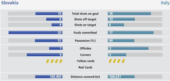 因?yàn)樗孤宸タ诉M(jìn)行緊逼防守,與意大利隊(duì)肉搏,因此場(chǎng)上對(duì)抗激烈,斯洛伐克隊(duì)20次犯規(guī),而意大利隊(duì)也有17次法規(guī)。黃牌方面,兩隊(duì)可吃到四張,場(chǎng)上局面可謂是火星四射。