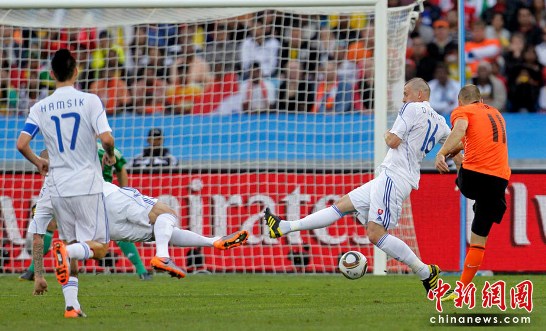 中新網(wǎng)6月28日電 今晚22:00,南非世界杯1/8決賽第五場比賽在德班球場拉開戰(zhàn)幕,由E組頭名荷蘭隊迎戰(zhàn)F2第二名斯洛伐克。憑借羅本和斯內(nèi)德在上下半場的進球,荷蘭隊以2-1淘汰斯洛伐克。補時階段,維泰克為斯洛伐克隊攻入一粒安慰性的點球。