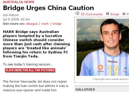 中新網7月9日電 布里奇,一個天津泰達隊球迷都不會陌生的名字。這位澳大利亞外援曾在本賽季初效力于天津泰達隊,現在已經離開中超加盟悉尼FC隊。日前他在接受澳大利亞《442》雜志采訪時憤怒的回憶了在中超的悲慘生活。他表示,中超的球員就像畜生一樣被對待。