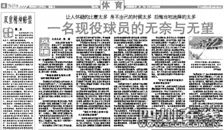 今年9月2日進(jìn)行的中甲聯(lián)賽中,四川隊(duì)坐鎮(zhèn)主場(chǎng)四川大學(xué)體育場(chǎng)對(duì)陣青島海利豐,客場(chǎng)作戰(zhàn)的海利豐3球領(lǐng)先,但該隊(duì)隊(duì)員卻在最后時(shí)刻連續(xù)三次吊射本方球門,不得不讓人懷疑有人在操控比賽。中青報(bào)這篇《一名現(xiàn)役球員的無(wú)奈與無(wú)望》的報(bào)道就從這場(chǎng)比賽切入正題,報(bào)道中稱,一名不愿意透露姓名的川足隊(duì)員說(shuō),“我也想盡早知道這場(chǎng)球的調(diào)查結(jié)果,我不是希望青島被罰降級(jí)或四川留在中甲,我是真想知道能不能從這場(chǎng)比賽中找到假球的證據(jù)!