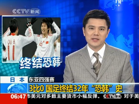 央視新聞以《3比0 國(guó)足終結(jié)32年“恐韓”史》為題,詳細(xì)的描述了三粒進(jìn)球的過(guò)程。在這段長(zhǎng)達(dá)1分多鐘新聞中,還配有國(guó)足比賽的實(shí)況錄像和現(xiàn)場(chǎng)圖片。最后,新聞還簡(jiǎn)要回顧了國(guó)足32年“恐韓癥”的歷史,并評(píng)論昨天的比賽,是以“一場(chǎng)完勝終結(jié)了32年的恐韓癥歷史”。