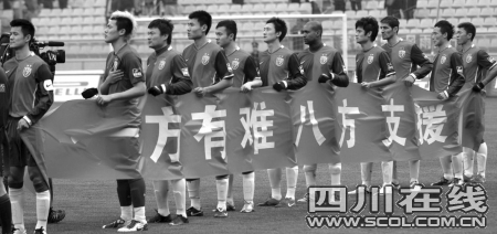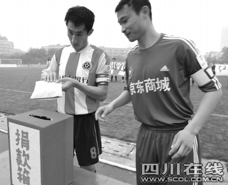 2:1的勝利結(jié)束之后,連續(xù)兩 場(chǎng)進(jìn)球的成足隊(duì)長(zhǎng)李鋼說(shuō),“希望災(zāi)區(qū)的人們像我們今天比賽一樣,無(wú)論遇到什么樣的困難,只要我們團(tuán)結(jié)一心,只要我們選擇堅(jiān)強(qiáng),我們都能獲得最終勝利!”比賽結(jié)束之后,球迷散去的人群中還有纏著綠絲帶的志愿者球迷在募捐,“球賽盡管結(jié)束了,可是我們還想為災(zāi)區(qū)再多做一點(diǎn)事情,我們做得越多,他們受到的苦難就會(huì)越少!