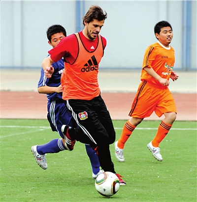 由于球員傷病或去國家隊備戰(zhàn)世界杯,勒沃庫森隊中阿德勒、克羅斯和基斯林等無法來華,不過前德國國腳M·弗里德里希以及辛基維奇、卡斯特羅和黑爾默斯等明星球員均隨隊前來,全隊最大牌的還是德國前國家隊主教練沃勒爾。昨天下午,弗雷德里希等球員來到回民中學(xué),在球場上對學(xué)校小球員們進(jìn)行了技術(shù)指導(dǎo)。