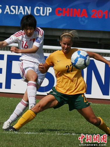 中新網(wǎng)成都5月23電(記者劉忠俊 劉賢)5月23日,2010年女足亞洲杯B小組賽中國(guó)迎戰(zhàn)澳大利亞隊(duì),比賽開(kāi)后,澳大利亞占上風(fēng),中國(guó)姑娘們奮力防守,在開(kāi)場(chǎng)9分鐘左右,中國(guó)隊(duì)16號(hào)前衛(wèi)突破對(duì)方防守,帶球攻門成功,為中國(guó)隊(duì)攻進(jìn)第一個(gè)球。