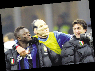 能在9人應(yīng)戰(zhàn)、裁判判罰也不大利于自己的情況下取勝,國米球員們賽后當然也顯得興奮異常,隊長薩內(nèi)蒂向球迷致敬,不少藍黑球員圍抱在一起跳舞唱歌,更為搞笑的是,國米替補鐵衛(wèi)馬特拉齊,再度發(fā)揚自己惹是生非、挑釁對手的風格,居然戴上了一副不知道從哪里搞來的AC米蘭主席貝盧斯科尼的面具,來嘲諷這位丑聞不斷的意大利總理。盡管不能上場,但大馬善于嘲弄與惡搞對手的頑劣本性,依舊是沒有改變。而AC米蘭球迷與球員,在看到自己的球隊主席與老板,慘遭對手惡搞,只能是恨得牙癢癢,又無可奈何。