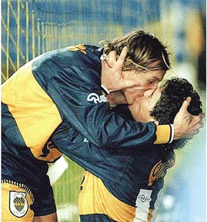 阿根廷人的豪放這一刻展現(xiàn)得淋漓盡致,主角是球王和風(fēng)之子。當(dāng)時(shí)風(fēng)之子接到球王的妙傳破門得分,兩個(gè)人當(dāng)場不顧全場所有觀眾和其他的隊(duì)友激吻在一起,長達(dá)6分鐘,而且還是“舌吻”!當(dāng)時(shí)引起了全世界的轟動(dòng)!好戲還在后頭:卡尼吉亞的老婆說:“馬拉多納是同性戀,他喜歡親吻卡尼吉亞的嘴唇!碑(dāng)然老馬很生氣,但是他表示:“看在卡尼吉亞的份上就不追究了!”