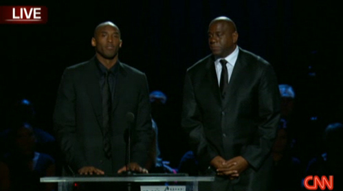 在追思會(huì)進(jìn)行到中斷的時(shí)候,約翰遜和科比身著黑西裝緩緩步入講臺?票仍诎l(fā)表感言時(shí)說,“我們每個(gè)人都應(yīng)該銘記邁克爾·杰克遜的貢獻(xiàn),他活在我們的記憶中.在臺上和臺下的他一樣精彩,他永遠(yuǎn)與我們同在!