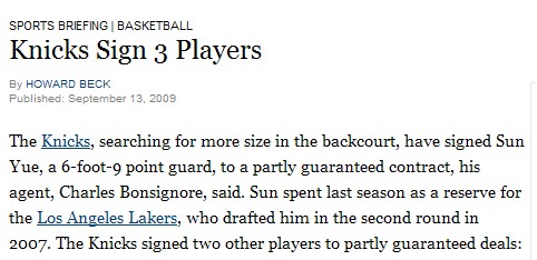 中新網(wǎng)9月14日電 北京時(shí)間昨日晚,《紐約時(shí)報(bào)》曝料稱:孫悅的經(jīng)紀(jì)人查爾斯·包辛諾透露,尼克斯已經(jīng)同中國球員孫悅簽訂了一份部分保障合同,補(bǔ)強(qiáng)球隊(duì)后場(chǎng)。