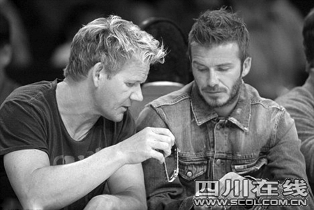和小貝一起看球的,是英國(guó)頂級(jí)廚神戈登·拉姆塞,因其在各種名人烹飪節(jié)目中粗魯、嚴(yán)苛,以及追求完美的風(fēng)格,被媒體稱為“地獄廚師”。貝克漢姆與拉姆塞的關(guān)系匪淺,正是小貝幫助拉姆塞進(jìn)入了洛杉磯的名人圈子,并幫助他打響了在美國(guó)的招牌。當(dāng)天,拉姆塞就坐在小貝包下的價(jià)值2200美元的座位上,也許是場(chǎng)上湖人的表現(xiàn)確實(shí)不佳,兩人無聊之