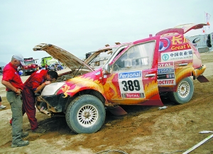 至本報(bào)昨天截稿時(shí),中國(guó)車手除趙永國(guó)退賽外,只有金城摩托車隊(duì)的蘇文敏完成了第七賽段的艱苦比賽。而后續(xù)的情況是,汽車組威麟車隊(duì)的老將盧寧軍以10小時(shí)1分第32個(gè)完賽,成為當(dāng)天汽車組中國(guó)車手中唯一沒有被罰時(shí)的人。其余3位車手因?yàn)樵诮M委會(huì)關(guān)門時(shí)間之后才返回,均被罰12小時(shí)。在不計(jì)被罰時(shí)間的情況下,長(zhǎng)城車隊(duì)的周勇成績(jī)是15小時(shí)08分45秒,列賽段第44。老盧的隊(duì)友江耀桓用了16小時(shí)38分11秒,賽段成績(jī)第57。興業(yè)銀行酷車時(shí)代的朱金忠用時(shí)16小時(shí)47分30秒,成績(jī)列第58位。