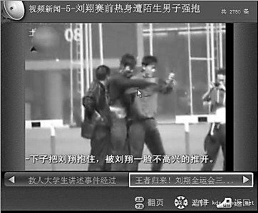 當(dāng)劉翔脫下白色外套換上釘鞋,準(zhǔn)備開(kāi)始練跨欄時(shí),一個(gè)穿黑色上衣,背著運(yùn)動(dòng)包的陌生男子,從劉翔身后一下子把他抱住,臉上還露出了莫名的微笑,一副幸福的表情。這個(gè)怪異得近乎詭異的舉動(dòng)一下子把劉翔給惹火了,此前還一臉?lè)潘傻娘w人,一下子板起面孔,雙手用力一揮把男子推開(kāi),向前走了兩步之后嘴里還忍不住嘟囔了幾句。