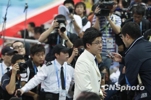 昨天東亞運的跳水比賽,當現(xiàn)場司儀介紹隊員名單時,霍啟剛起身走出貴賓室,來到看臺上的貴賓席。此時,記者乘機進了貴賓席,“潛伏”在霍啟剛的后一排,與他的距離不到30厘米。
