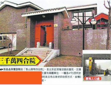 現(xiàn)在,越來越多的跡象都在表明郭晶晶和霍公子的婚期已近。昨天,香港一媒體爆出郭晶晶正準(zhǔn)備裝修去年霍家所贈(zèng)的價(jià)值3000萬人民幣的豪華別墅,并稱“這很有可能就是他們倆在北京的婚房!”據(jù)說,這套別墅位于北京海淀區(qū)四季青鎮(zhèn)門頭村,在五環(huán)以外。據(jù)記者了解,該樓盤的中式院落獨(dú)棟別墅面積為300—550平米之間,另外,每棟別墅送150平米的地下室。該別墅在2007年的預(yù)估開盤價(jià)就高達(dá)55000—60000元/平米。難怪媒體都將這一帶的房子稱作“北京頂級(jí)私人豪宅群落。”