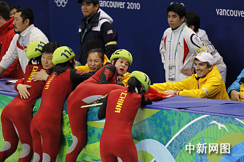 在裁判宣布韓國(guó)隊(duì)犯規(guī)后,一直等候著最終結(jié)果的中國(guó)姑娘忘情地?fù)湎蚪叹毾。圖片清楚地顯示,興奮的王濛撲到教練李琰前面寬寬的防護(hù)墊上,她的右腿無(wú)意間高高抬起,冰刀刮到了跟在她身后的張會(huì)的下巴。王濛意識(shí)到自己闖了禍,馬上關(guān)切地回頭察看張會(huì)的傷情。四位姑娘舉著國(guó)旗慶祝勝利時(shí),張會(huì)用手捂著她的下巴,漸漸地鮮血浸濕了她的手套。