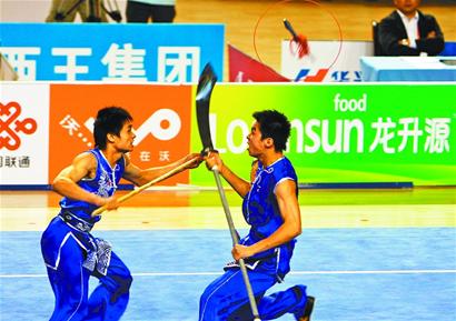 本以為昨天的兩次斷棍事故會(huì)給所有參賽隊(duì)敲響警鐘,但通過(guò)今晚的比賽來(lái)看,起碼廣西隊(duì)和已經(jīng)出現(xiàn)過(guò)一次事故的四川隊(duì)并沒(méi)有重視比賽器材的選擇和維護(hù)。在男子對(duì)練比賽中,廣西隊(duì)的黃俊華/黃杰第三個(gè)出場(chǎng),他們表演的項(xiàng)目是樸刀進(jìn)槍,也就是長(zhǎng)刀與長(zhǎng)槍的對(duì)抗。比賽進(jìn)行到了一半,黃俊華一刀砍向使槍的黃杰,長(zhǎng)槍抬起格擋時(shí)意外發(fā)生,長(zhǎng)槍的木桿與刀刃接觸后立刻斷為兩截,廣西隊(duì)本項(xiàng)比賽沒(méi)有獲得成績(jī)。