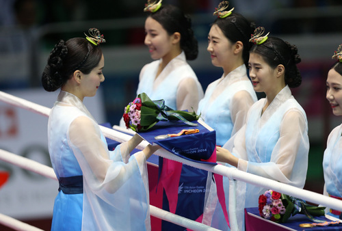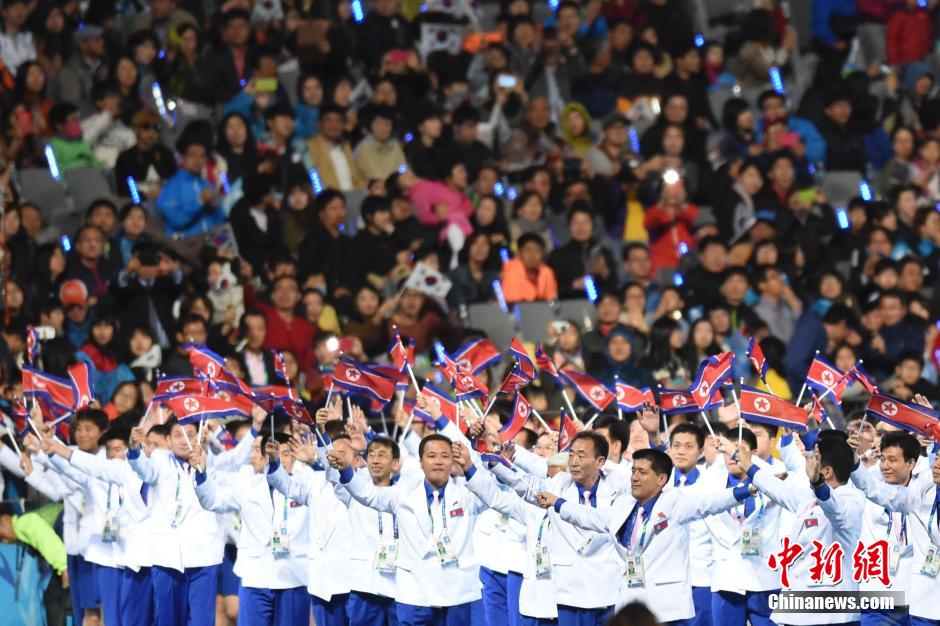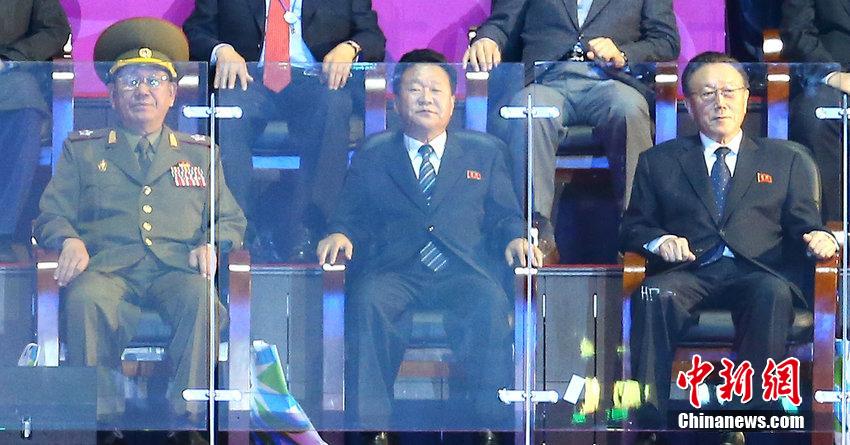 第17屆亞運會于4日晚在仁川主體育場舉行閉幕式,朝鮮高級代表團成員出席。當(dāng)?shù)貢r間晚8時10分許,當(dāng)朝鮮運動員入場時, 黃炳誓等人起立向運動員揮手致意,體育場內(nèi)掌聲響起。