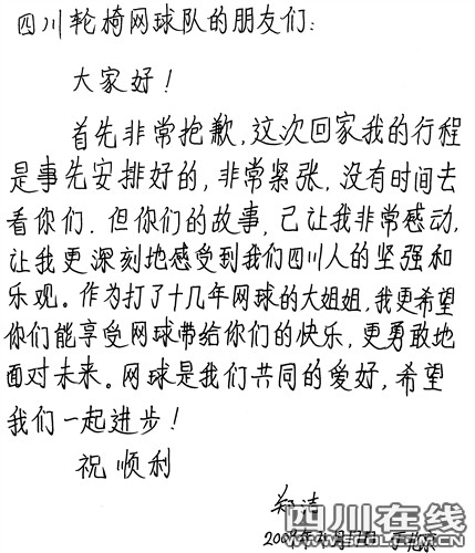 “四川輪椅網(wǎng)球隊(duì)的朋友們,大家好……”在輪椅網(wǎng)球隊(duì)隊(duì)員的簇?fù)硐,教練陳林一個(gè)字一個(gè)字地讀著鄭潔的回信,偌大的網(wǎng)球場(chǎng)一下就安靜下來(lái)。上個(gè)月來(lái)到災(zāi)區(qū)獻(xiàn)愛(ài)心的鄭潔,通過(guò)本報(bào)記者了解到了四川輪椅網(wǎng)球隊(duì)的情況后,這位重情義的川妹子立刻承諾要寫(xiě)信鼓勵(lì)隊(duì)員。在奔赴德國(guó)比賽前,鄭潔將親筆信和20多張簽名照片快遞給了本報(bào)記者,并委托記者一定要親手交到隊(duì)員們的手中。