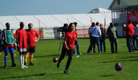 這次親臨南非賽場(chǎng),對(duì)于章子怡來(lái)說(shuō)是個(gè)難得的機(jī)遇,而且有幸與她喜歡的昔日球星合影作為永遠(yuǎn)的留念。她說(shuō):“我今年作為特奧大使受邀來(lái)到南非。這一次,特奧會(huì)舉辦了‘團(tuán)結(jié)杯’比賽,希望通過(guò)足球這項(xiàng)大家都熱愛的運(yùn)動(dòng),讓更多人了解智障這個(gè)群體。”所以作為特奧大使,她必須要真槍真刀地上賽場(chǎng),參加“揭幕戰(zhàn)”比賽。“我算是個(gè)球迷,很喜歡看球,只是近幾年拍戲不太有時(shí)間看了。這次來(lái)南非要上場(chǎng)踢球還是我人生第一次,我只能勉強(qiáng)算個(gè)入門級(jí)‘球員’吧!保伦逾f(shuō),所幸的是與前亞洲足球先生中田英壽、NBA球星迪坎貝·穆托姆博、法國(guó)前國(guó)家隊(duì)隊(duì)員克里斯蒂安·卡倫布等結(jié)為隊(duì)友,“以前是在電視上有距離地看這些球星在球場(chǎng)上大展雄風(fēng),這次竟然與他們?cè)谝粋(gè)綠茵場(chǎng)上踢球,我覺得真的難以想象”。這些球星們很敬業(yè),當(dāng)看到章子怡動(dòng)作不夠標(biāo)準(zhǔn)的時(shí)候,會(huì)友善地給她示范,“我非常激動(dòng)能在賽場(chǎng)與他們相遇,正好合影留個(gè)念”。
