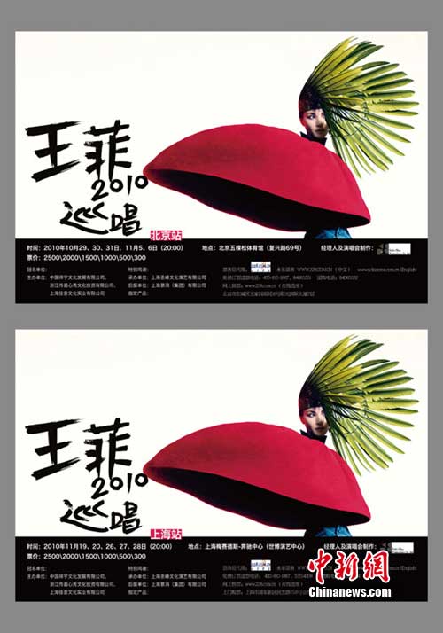 中新網(wǎng)7月9日電 王菲今年將在北京、上海兩地開十場演唱會,今日,演唱會海報曝光,天后身穿羽毛裝,造型十分獨特。