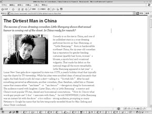 《新聞周刊》回顧了小沈陽(yáng)參加去年中央電視臺(tái)春節(jié)聯(lián)歡晚會(huì)的情景說,那天晚上,他抖的“包袱”里雖然沒有黃段子,但這名新人還是穿了一條裙子——蘇格蘭裙。在這臺(tái)晚會(huì)的6億多觀眾面前,小沈陽(yáng)一炮走紅。成千上萬(wàn)的網(wǎng)民去網(wǎng)絡(luò)上搜索他的資料,他的點(diǎn)擊率一下子超過了很多中國(guó)名人。