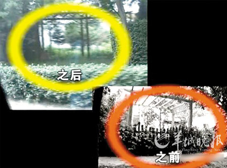 昨天上午11時,記者再次來到郭宅后院,記者發(fā)現(xiàn)3個小時之前仍然存在的侵占公共綠地的綠色木柵欄已經(jīng)被拆除大部分,周邊只剩下部分被拔下來的柵欄殘骸。但是院內(nèi)假山、水池,以及綠色涼亭仍然存在。據(jù)了解,之前城管部門曾經(jīng)確認(rèn)此部分也屬違建。