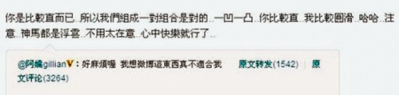 阿Sa和鄭中基雖然決定離婚,但從未說出具體原因。在“Sa霆戀”曝光后,輿論開始傾向男方,還有消息稱鄭中基“癡心等待阿Sa回心轉(zhuǎn)意”。阿嬌卻第一個跳出來反駁,她在微博中寫道:“真的,公道自在人心!你(阿Sa)不說出離婚原因,對他已經(jīng)算仁至義盡了!錯不在你,你要知道我們都很愛你的!”此微博被瘋狂轉(zhuǎn)發(fā),網(wǎng)友紛紛向阿嬌追問幕后真相,阿嬌最終刪掉此文,并且大發(fā)牢騷:“我想微博這東西真不適合我。”倒是阿Sa比較豁達,在微博上留言給阿嬌,稱“神馬都是浮云”,不用太在意。