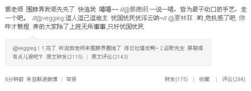 @veggieg:完了 聽說郭老師來圍脖界圈地了 浮云社堪憂啊~轉(zhuǎn)念一想 織圍脖這么女紅滴干活 郭老師還真不一定有那么細的針腳~ 呵~