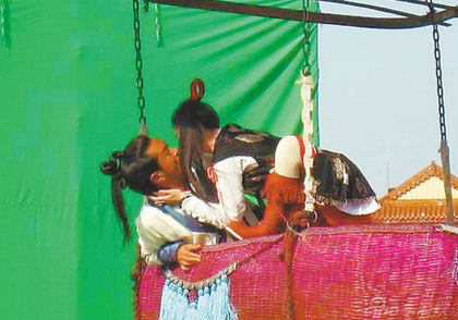 記者前往探班的一場(chǎng)戲,是該劇最后一幕:古天樂和大S經(jīng)歷種種波折終于走到了一起,在古天樂用風(fēng)箏和竹筐連成的“熱氣球”里度過浪漫時(shí)光。由于過于浪漫,大S演的俠女便起了“色心”,于是發(fā)生了強(qiáng)吻這一幕。