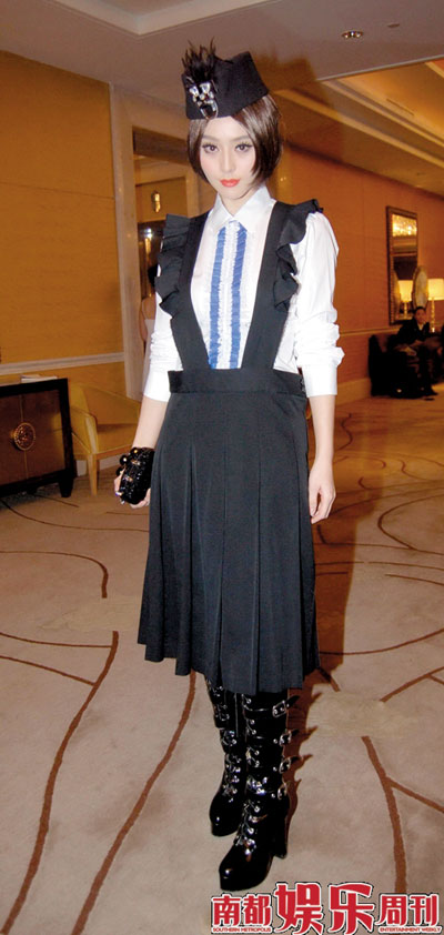 在所有范小姐的著裝標(biāo)識(shí)中,我們通常除了名牌看不到其他。但這一次,我們看到了,看到了可能是范冰姐企圖對(duì)“風(fēng)格”的一種創(chuàng)造。學(xué)院派裙子和搖滾靴子的組合,在范小姐的具體實(shí)踐中,成為了大堂服務(wù)生的制服創(chuàng)新的最佳示范。
