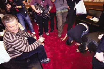 1月28日,北京,央視春節(jié)聯(lián)歡晚會在1月25日除夕夜舉行。零點(diǎn)鐘聲敲響后,與師傅成功搭檔表演小品《不差錢》的小沈陽和眾徒弟按照東北習(xí)慣,跪地給師傅趙本山磕頭拜年。