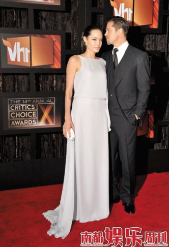 自從兩人生孩子后,感情有增無減,朱莉的這身白色曳地長(zhǎng)裙如希臘女神般優(yōu)雅,彼特只要站著當(dāng)當(dāng)甘草,兩人就是最般配的一對(duì)。