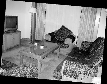 而在劇中和陳好演對手戲的“呂布”何潤東待遇就差點,和記者同住在影視城賓館,不過記者住的是標房,他住的是套房。記者剛入住時,服務員就熱情介紹:“最近這段時間,何潤東和陸毅都住在我們這里,他們都是老顧客了,很親切的,遇見我們都會朝我們微笑、打招呼!焙螡櫀|所住的套房,每層只有一間,掛價一千元,打折后是388元。記者昨天進了11層的唯一一間套房——409房查看一番。